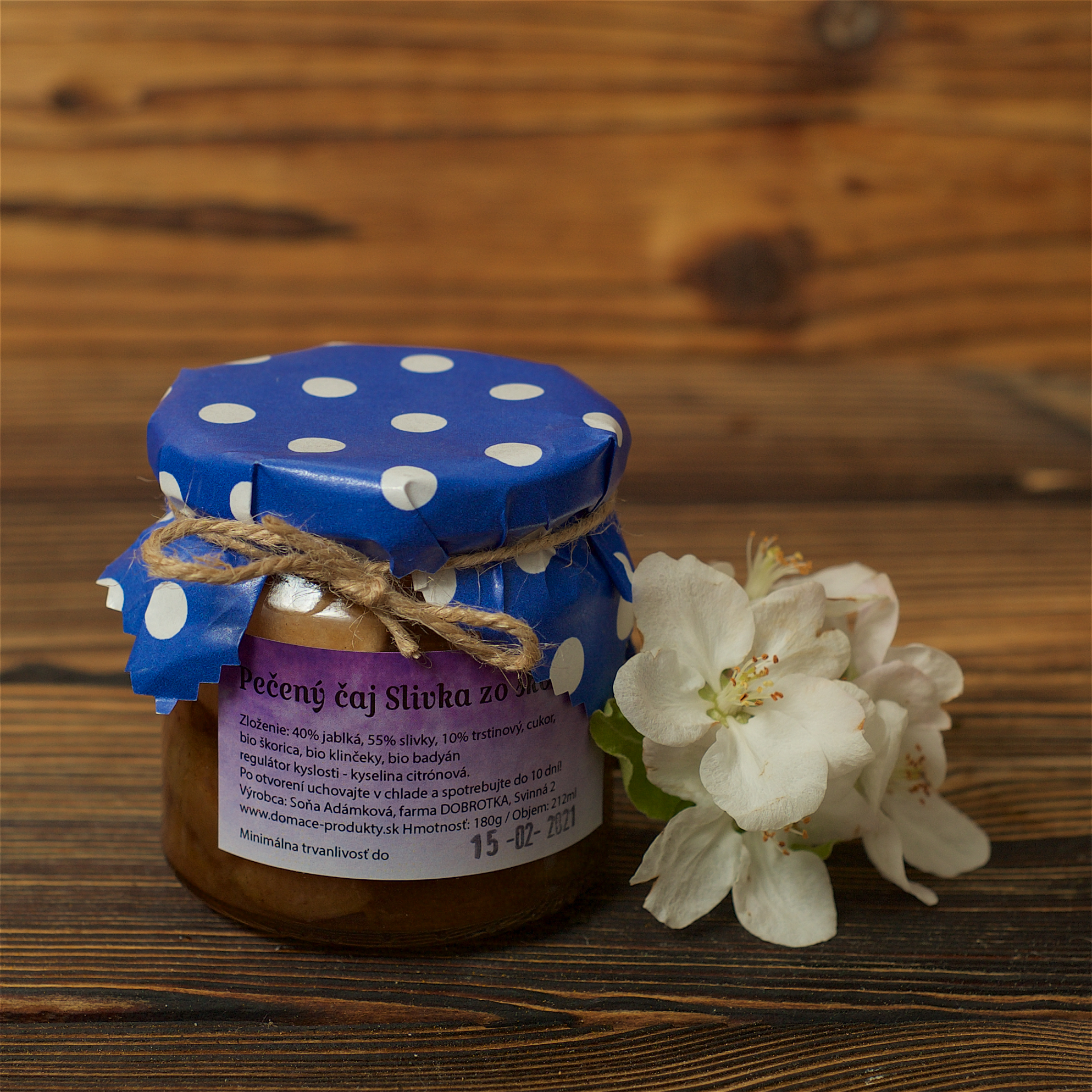 Zlozenie – 35% jablka, 60% dula , 10%  trstinovy cukor, bio badyan, bio skorica, bio klinceky, regulator kyslosti- kyselina citronova