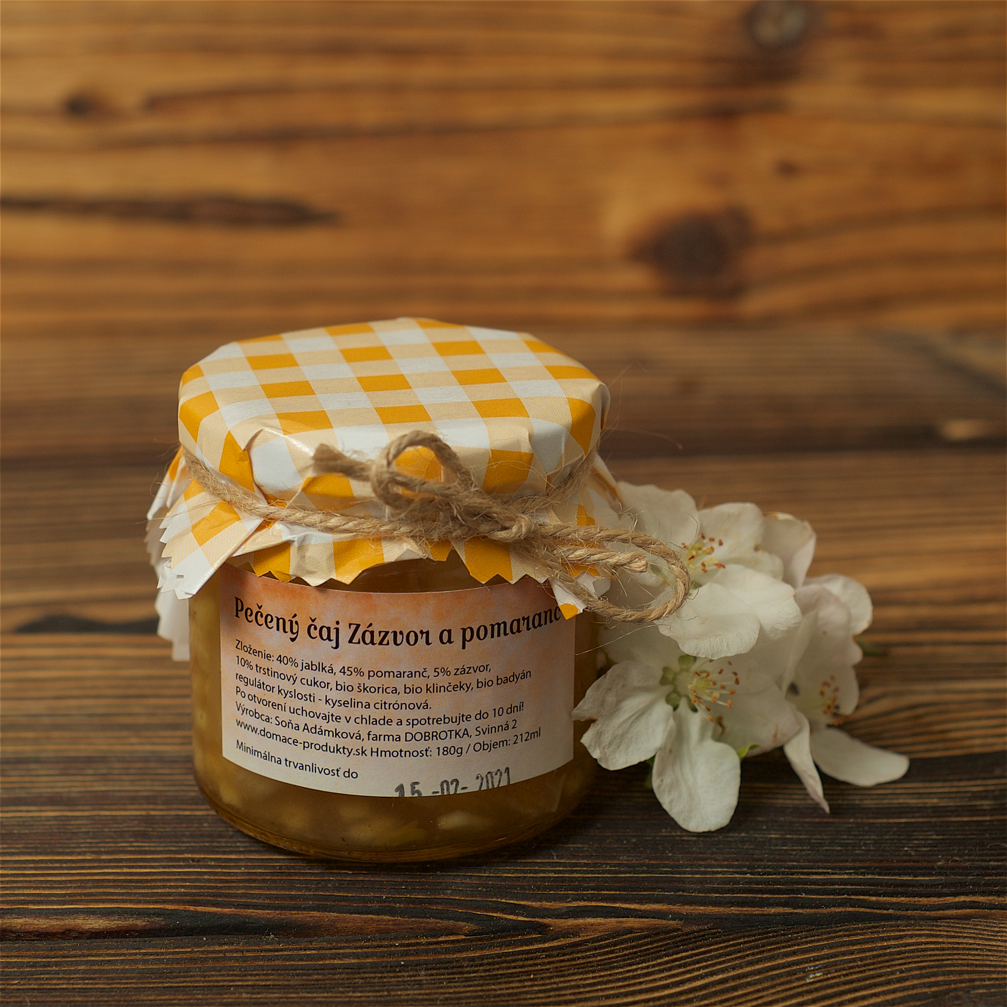 Zlozenie – 40% jablka, 45% pomaranc, 5 % zazvor, 15%  trstinovy cukor, bio badyan, bio skorica, bio klinceky, regulator kyslosti- kyselina citronova